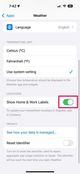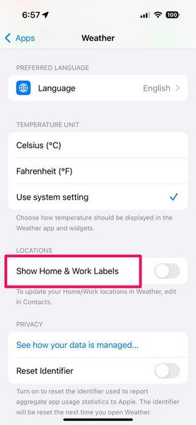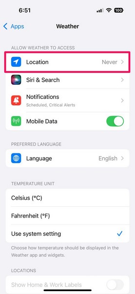 WeatherアプリがiOSデバイスのロケーションサービスにアクセスできるようにしたら、Weather App Settingsページで新しいShow Home&Work Labels設定のトグルを有効にする必要があります。それを行うには、下の手順に従ってください。