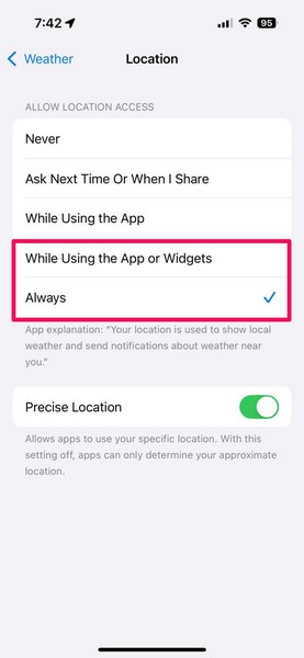 5。次に、[Location Access]セクションの下で、をタップしますいつもまたはアプリまたはウィジェットを使用している間オプション。切り替えます正確な場所以下の設定はオプションです。