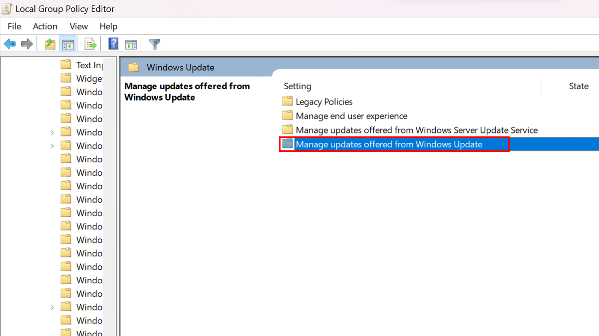 - このパスに開かれています:コンピューター構成>管理テンプレート>Windowsコンポーネント>Windows Update>Windowsアップデートから提供される更新を管理します