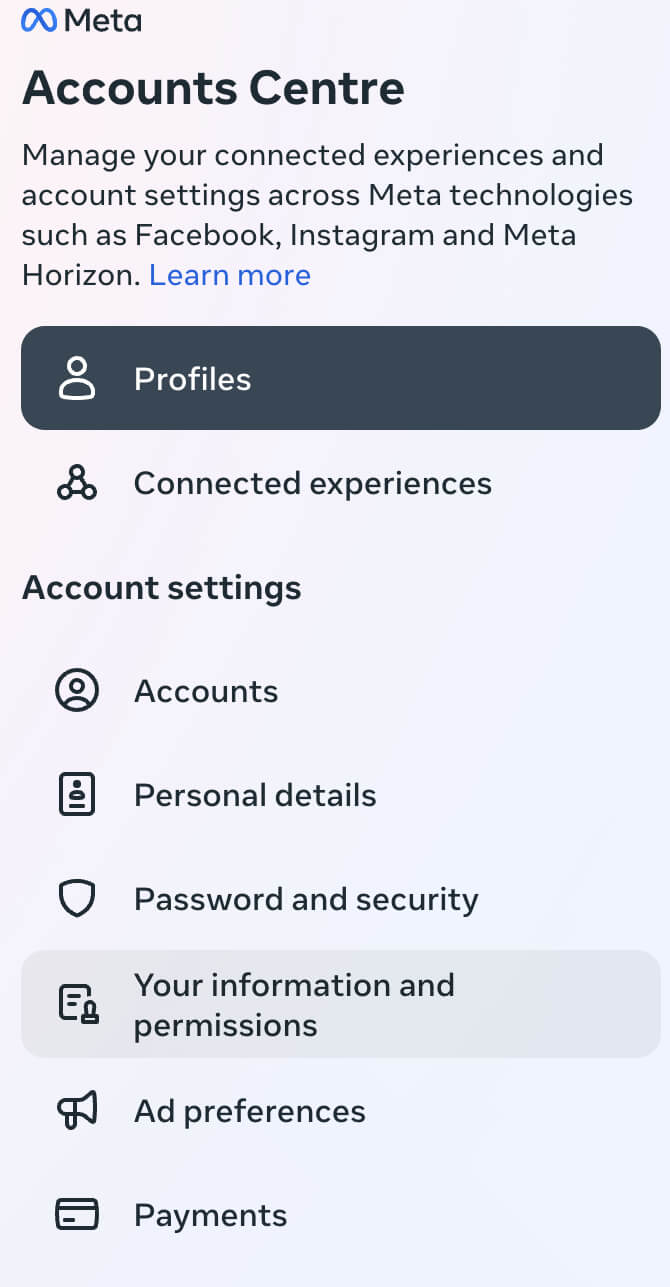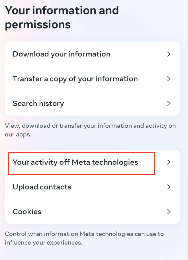 アカウントセンターを見つけたら、パスをたどることでオフメタテクノロジーの設定にアクセスできます。あなたの情報と許可>メタテクノロジーのアクティビティ。