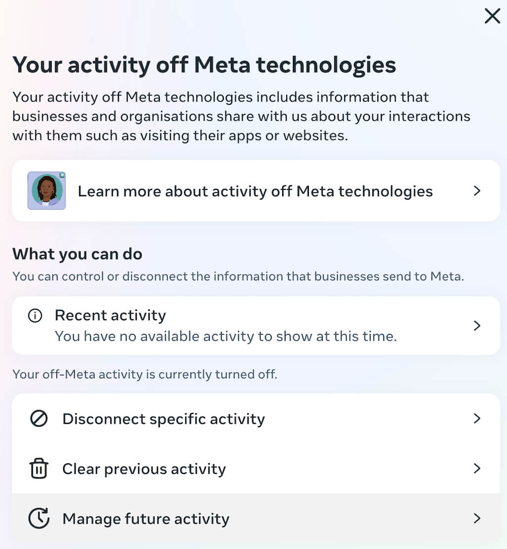 これで、FacebookとInstagramの両方からの追跡を制御できます。以前は、Facebook用にしか管理できませんでした。しかし、今では、Activity Off-Meta Technologiesと呼ばれる新機能を使用することで、両方のプラットフォームでオンラインアクティビティの追跡を停止できます。