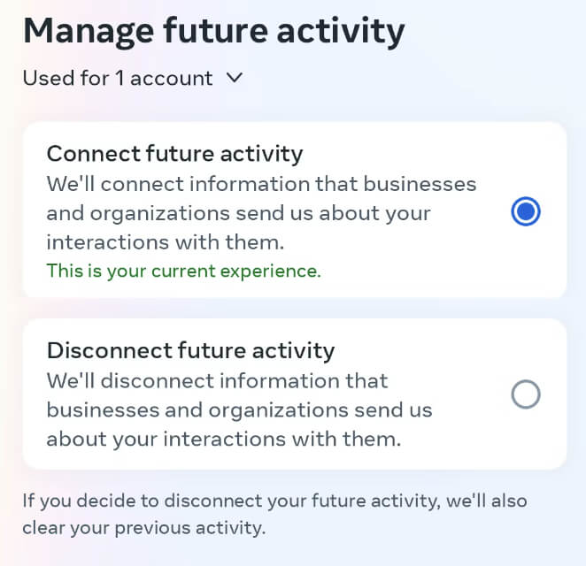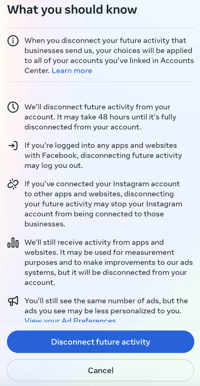 アカウントセンターを介して将来のアクティビティを切断したときに何が起こるかについて留意する必要があるいくつかのことを以下に示します。