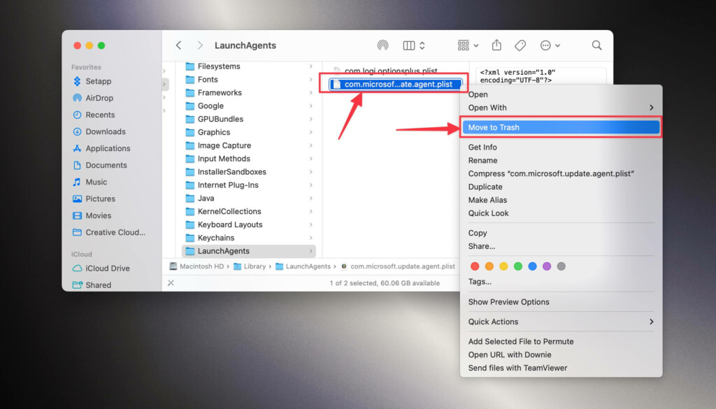 8。右クリックしますcom.microsoft.update.agent.plistファイルと選択ゴミに移動します。