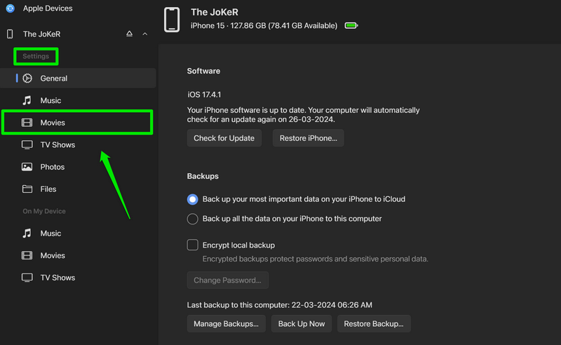 3。AppleデバイスアプリがiPhoneを検出したら、映画下のタブ設定左ナビゲーションバーのセクション。