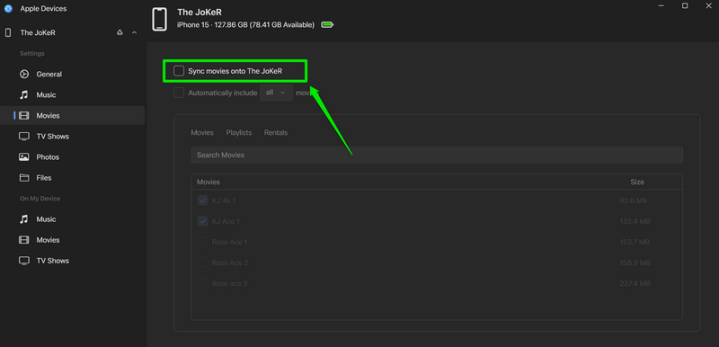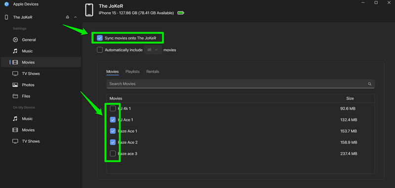 5。今、[iPhone名]を有効にする[iPhone名]に映画を同期します、 あなたはできるチェックボックスをクリックして、個々の映画を選択しますそれらのそれぞれの横に。