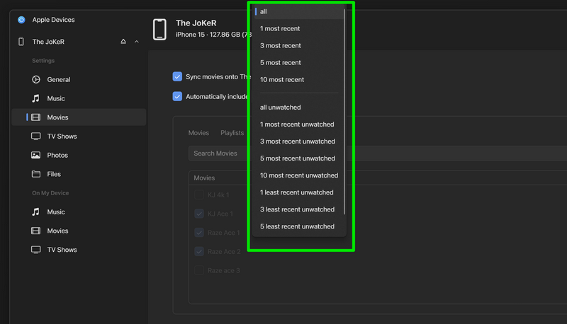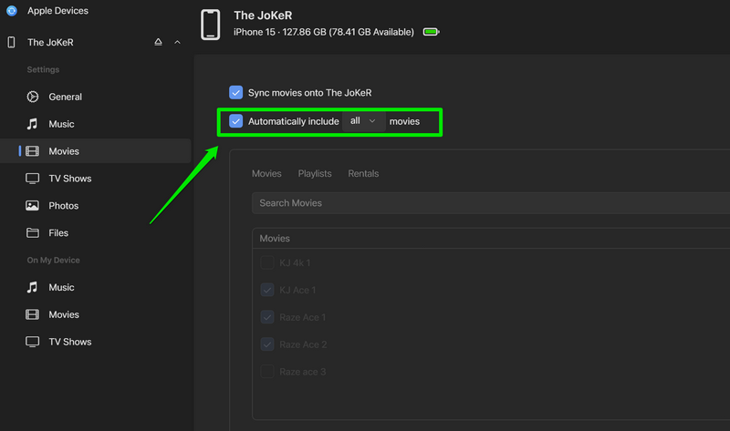 6。あなたがしたい場合は利用可能なすべての映画を同期しますあなたのiPhoneで、ボックスを確認してくださいのために[すべて]映画を自動的に含めます。