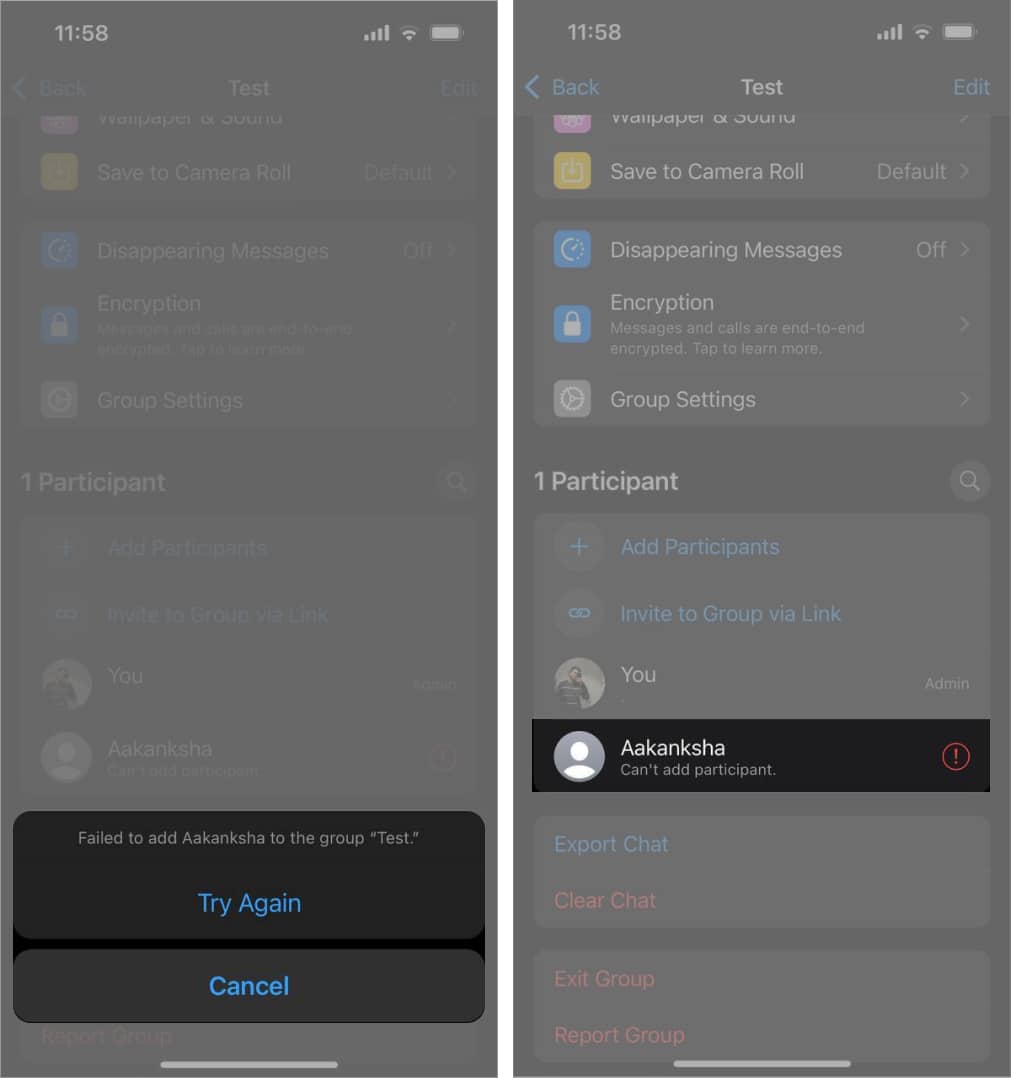 これを確認するには、一時的なWhatsAppグループを作成し、ユーザーをグループに追加します。ユーザーを追加できず、読み取るポップアップに遭遇した場合追加できませんでした<User>グループにまたは参加者を追加できません、それはあなたがブロックされたことを意味します。