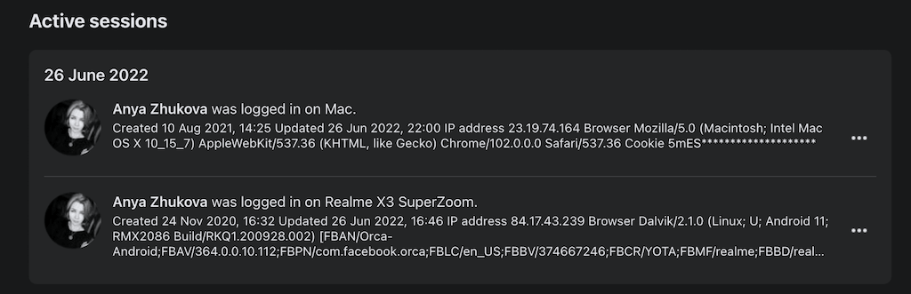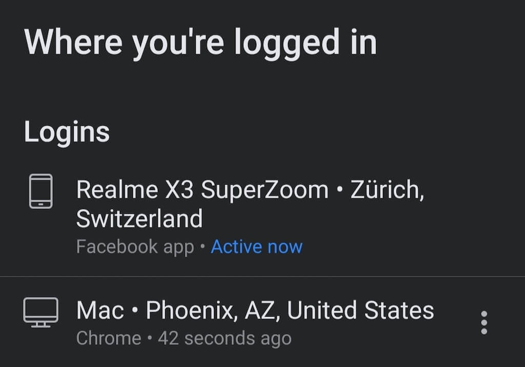 そこには、すべてのアクティブなFacebookセッションが表示されます。つまり、アカウントに記録されているデバイスのリストが表示されます。リストに認識されていないログインが表示された場合、ハッキングされた可能性があります。認識されていないリストからアクティブなセッションの横にある機密情報の損失を回避するために、選択します。ログアウト。これにより、アクティブなセッションが終了するため、そのデバイスでのハッキングの試みから救われます。
