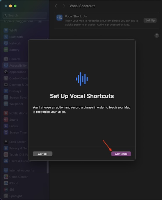 - Macで、システム設定アプリ - >アクセシビリティ - >ボーカルショートカットに移動します。