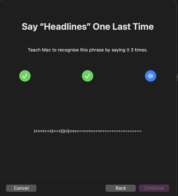 - カスタムフレーズを3回話して、必ずカスタムフレーズを確認してください。あなたはそれを正しく聞いた!フレーズを明確に確認しない限り、前進することはできません。だから、Macに少し近づき、フレーズを大声で話します。あなたのフレーズを手に入れるたびに、ティックマークが確認として表示されます。