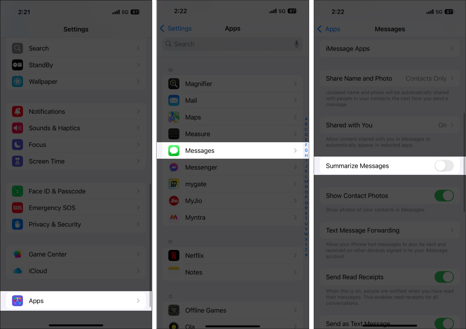 たとえば、メッセージアプリの通知のテキスト概要をオフにすることができます。設定→アプリ→メッセージ切り替えますメッセージを要約します。