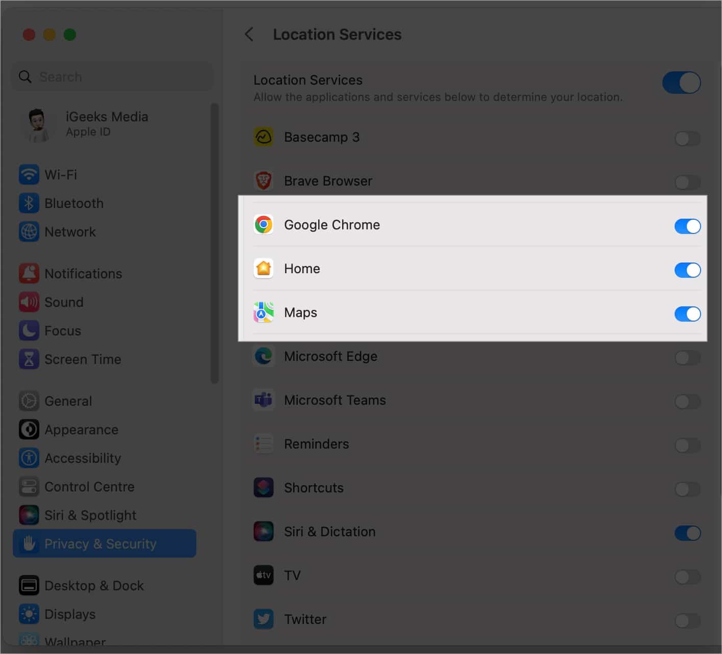 さらに、その特定のアプリの横にあるボタンを切り替えることにより、Mac上の特定のアプリのロケーションサービスを有効にすることもできます。