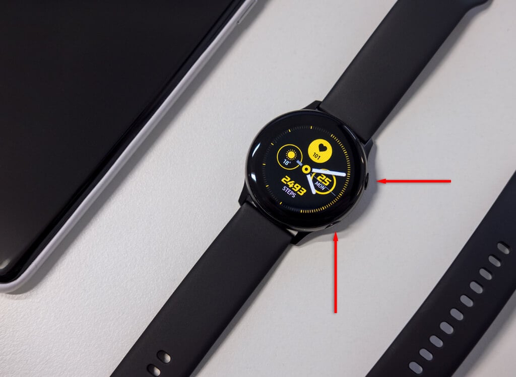 Samsung SmartWatchが反応しない場合、押して保持することで再起動できますホームボタンそして戻るボタン同時に7秒間。背面キーは、時計の面の側面にある他の唯一のボタンです。