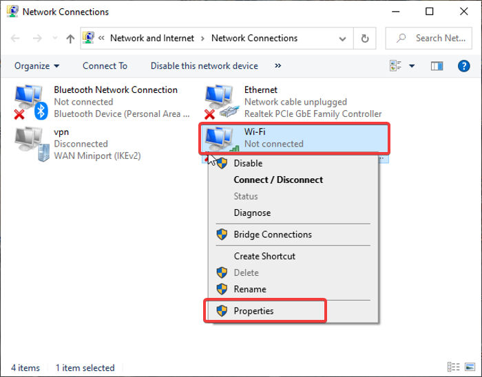 3。使用しているインターネット接続を右クリックします(ワイヤレス接続用のWiFiと有線接続のイーサネット)