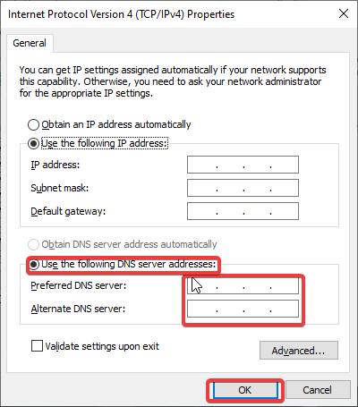 6。次に、確認します次のDNSサーバーアドレスを使用します箱。使用したいDNSで、優先および代替DNSサーバーボックスを入力します。