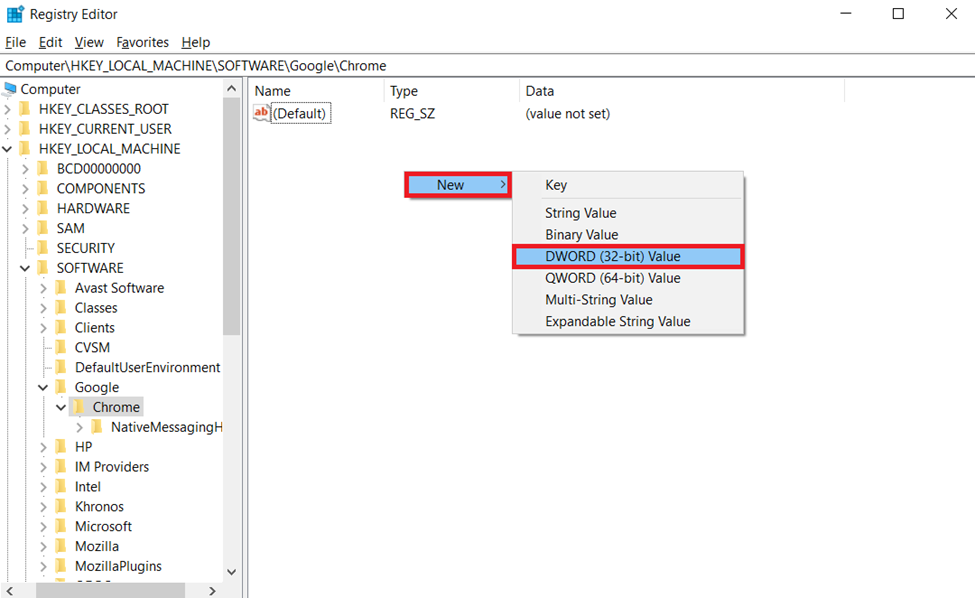 6。今、選択します新しいその後、オプションDWORD(32ビット)値サブメニューから、新しいキーを呼び出すことでプロセスを終了しますdonotupatoedgechromium。