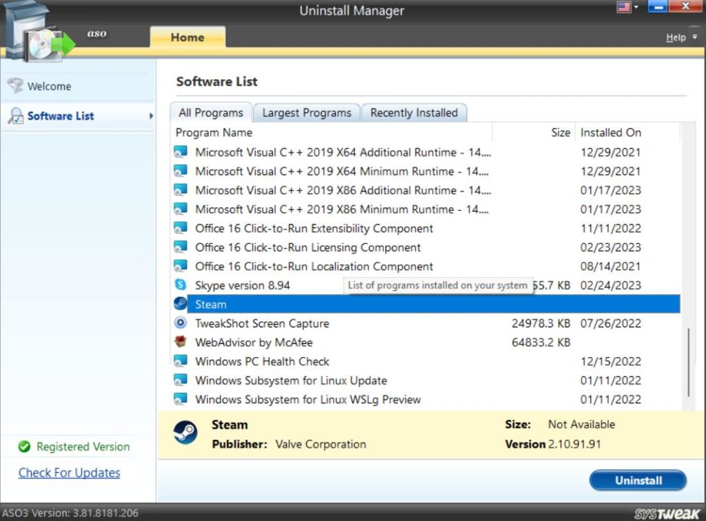 また、アプリを完全に削除するのに役立つサードパーティソフトウェアアンインストーラーを使用することもできます。これはまた、それ以外の場合は取り外された残骸または不要なファイルを削除するのに役立つことを意味します。 Advanced System Optimizerは、そのようなツールの1つです。それは主にです効率的なPCクリーンアップおよび最適化ツール、しかし、アプリケーションをアンインストールするための専用モジュールもあります。 Advanced System Optimizerを使用してソフトウェアをアンインストールするには -
