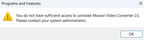 プログラムをアンインストールできないというもう1つのバリアントは、コントロールパネルしかし、それはあなたが管理権を持っていないことを示しています。以下のスクリーンショットに示されているように、エラーが発生する可能性があります -