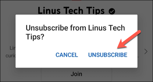 PCユーザーと同様に、動画の1つを見ている間、チャンネルからの登録解除もできます。再生ビデオの下(フルスクリーンモード以外)をタップします購読サブスクリプションを削除するボタン - これを行うときに登録を解除することを確認する必要があります。