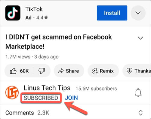 - チャンネルからサブスクライブを解除すると、ボタンが変更されます購読する- これにより、チャンネルに登録されなくなったことが確認されます。