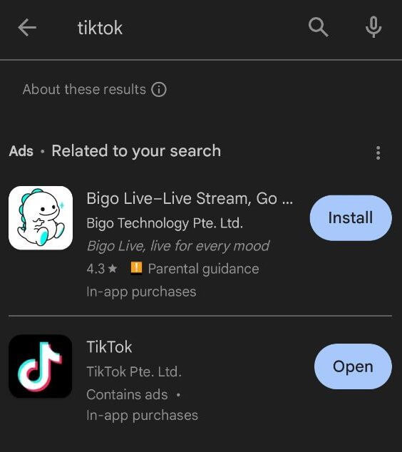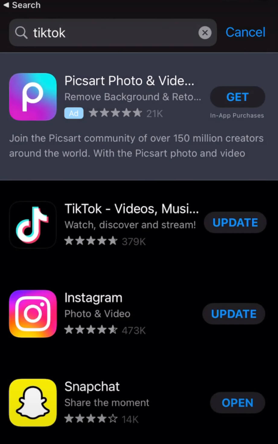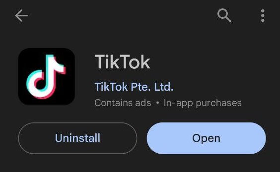 - アプリのリストにTiktokが表示されない場合、またはそれが書いている場合開けるの代わりにアップデートその隣には、アプリが更新され、何もする必要はありません。