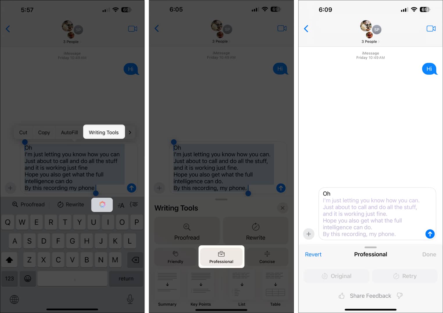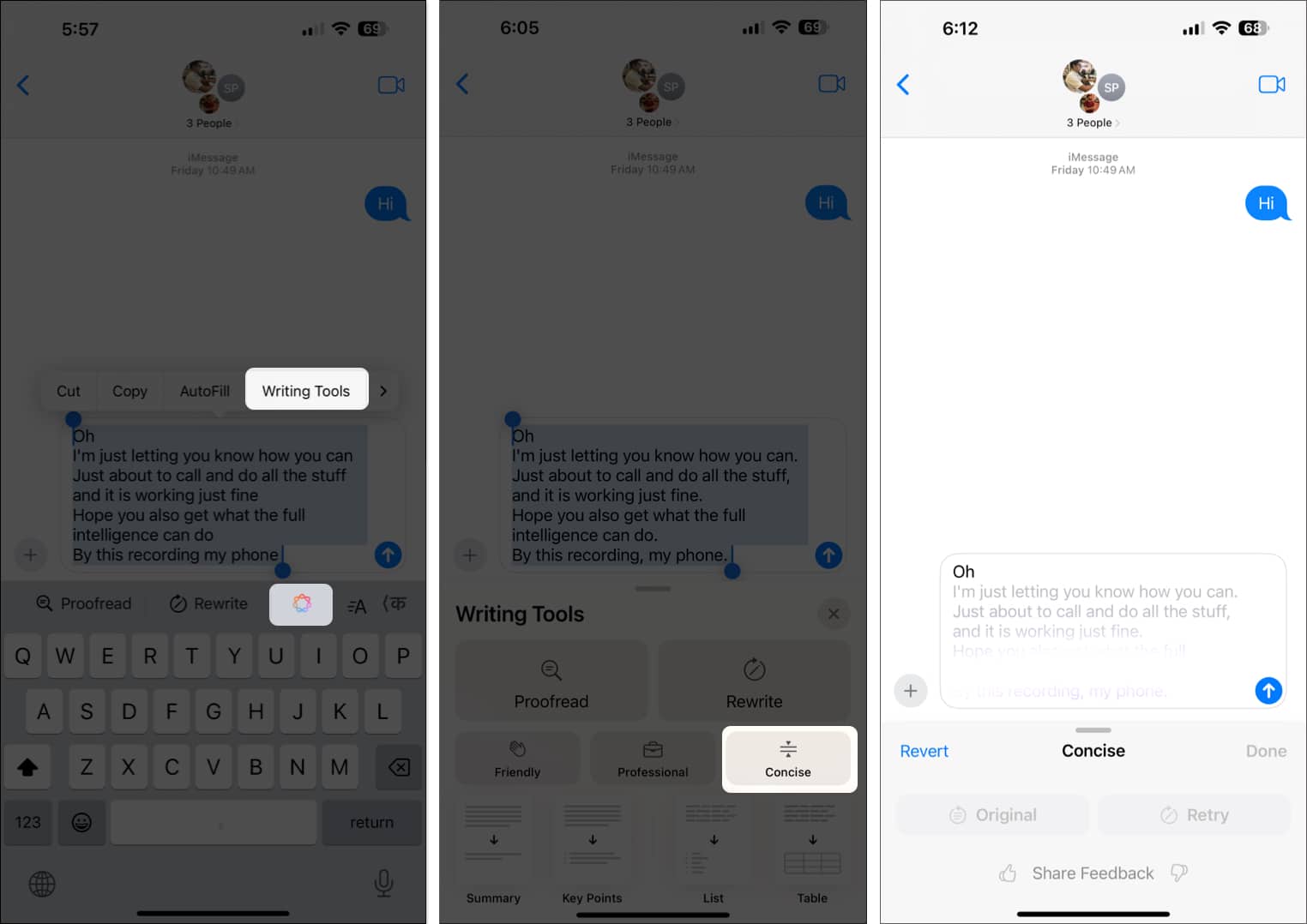 前述のように、テキストを書く任意のアプリでApple Intelligenceのライティングツールを使用できます。メッセージアプリでどのように機能するかを詳しく説明します。