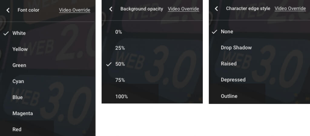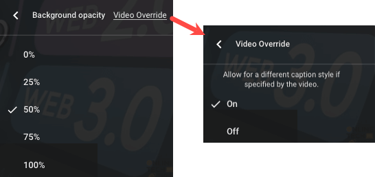 - 上記の各設定には、aが表示されますビデオオーバーライドポップアップの上部にあるオプション。自分の選択でビデオで指定されたキャプションまたはサブタイトル設定をオーバーライドする場合は、選択してくださいオフ。