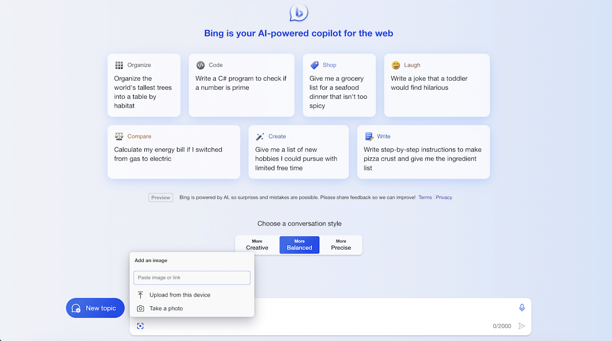 - チャットインターフェイスでは、3つの異なる会話スタイルから選択できます:クリエイティブ、バランスのとれた、正確です。すべてのスタイルには、カスタムバックグラウンドテーマがあります。