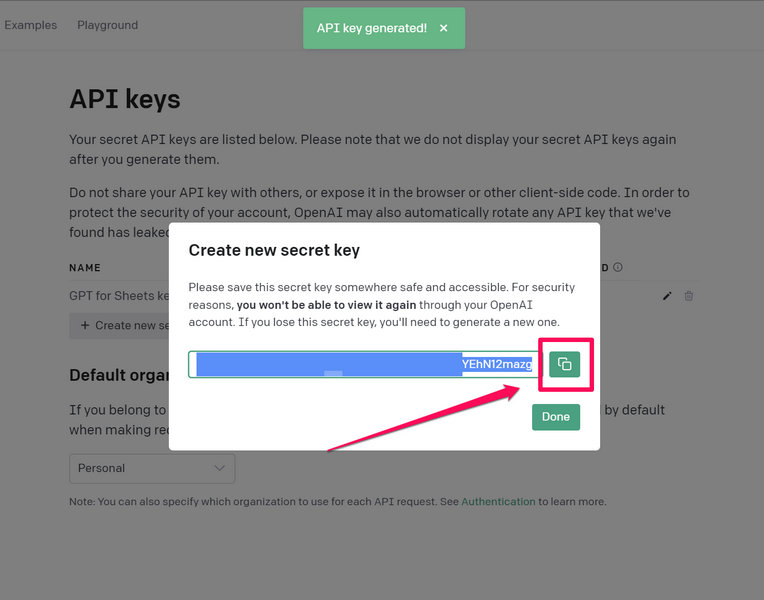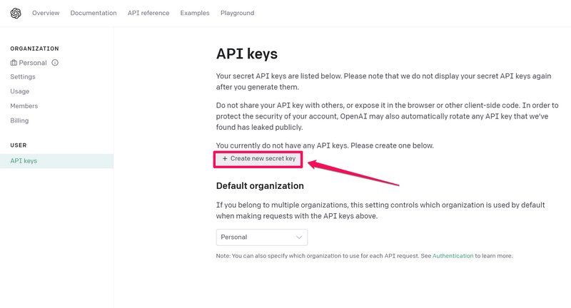 注記:このAPIキーは、OpenAIアカウント内で一度だけ表示できます。このキーを失った場合は、再生する必要があります。