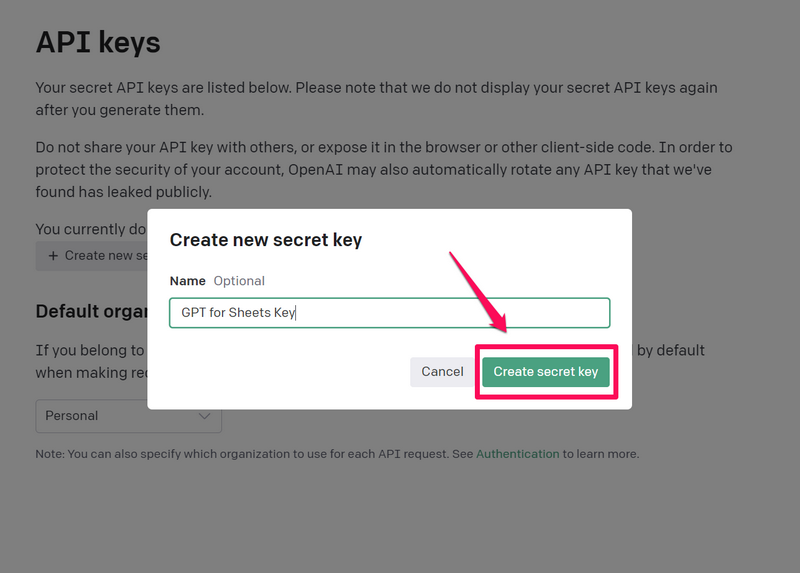 グーグルシート内のシートとドキュメントに実際にGPTを使用するには、OpenAI APIキーでセットアップする必要があります。したがって、OpenAI APIキーを生成するには、すぐ下の手順に従って、シートとドキュメントのGPTを使用して実行して実行します。