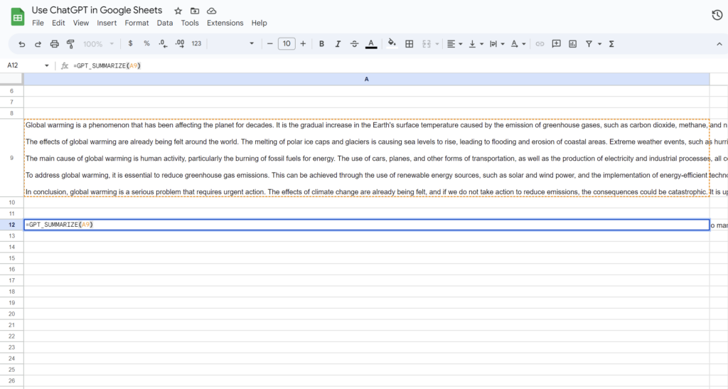 一例として、シート用のGPTを作成し、DocsはCell A9の地球温暖化に関する200ワードの記事を生成し、Cell A12の内容を要約しました。次のスクリーンショットで結果を確認できます。