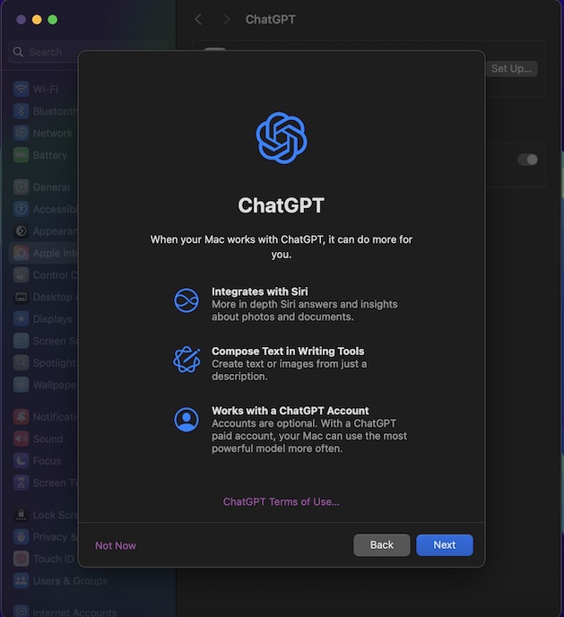 - 右側では、「」までスクロールします。Apple Intelligence&Siriを拡張します」セクションとヒットchatgpt。