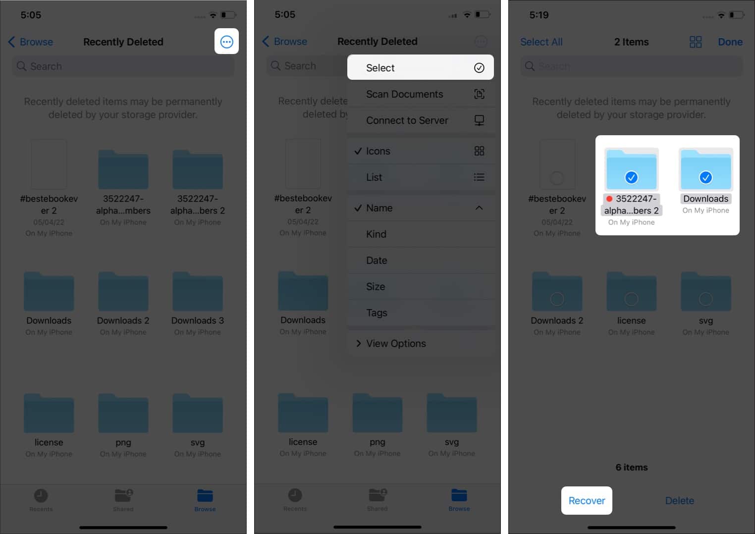 ここから、ファイルアプリからアクセスした最近のファイルを見ることができます。タップしてビューを整理できます4つの正方形上に、選択したオプションを選択します。