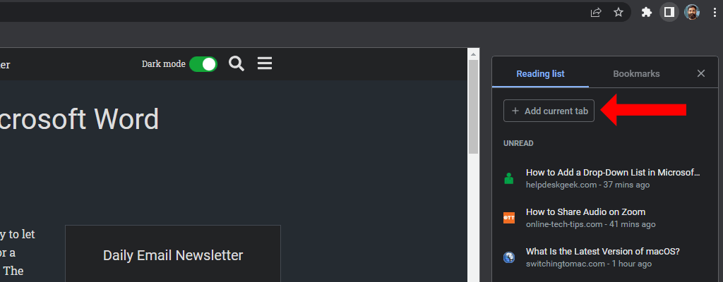 これでクリックできます読書リストサイドパネルの上部にあるボタン。読書リストにWebページを追加するには、クリックします現在のタブを追加します。このページは次のように表示されます未読Chromeリーディングリストのセクション。