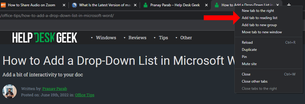 または、Chromeの[開い]タブを右クリックして選択できます読書リストにタブを追加します。これにより、Chromeの読書リストの保存されたページのリストに追加されます。
