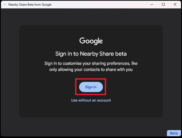 注記:Googleアカウントにログインすることなく、PCで近くの共有を使用できますが、それを選択した場合、画面がオフになった場合でも共有の好みをカスタマイズしたり、ファイルを自動的に受け入れたり転送したりするなどの機能にアクセスすることはできません。