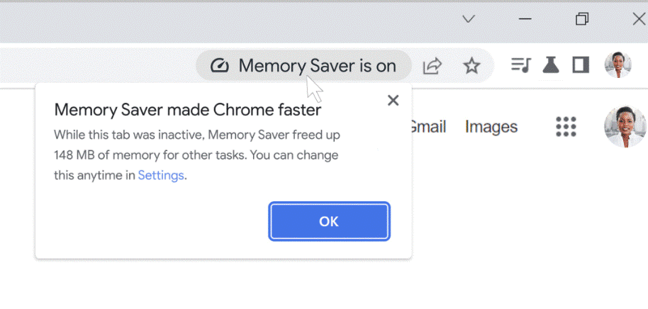 Webページをスムーズに維持するために、ChromeのMemory Saver機能により最大40%少ないRAMが消費されます。