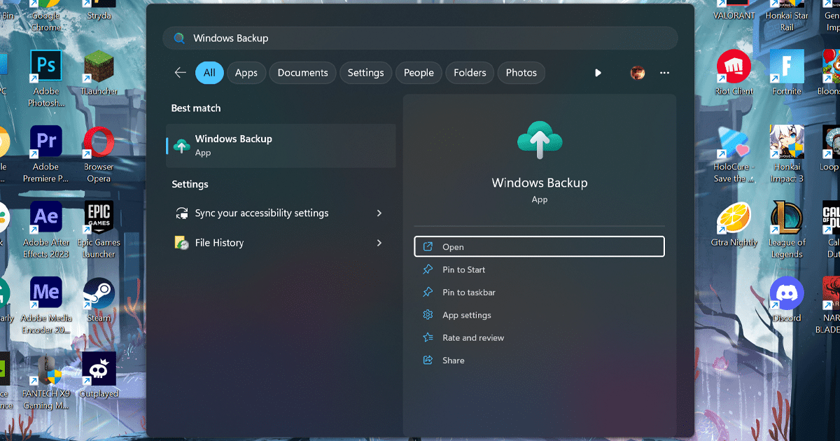 - 開きますスタートメニュー、 検索する "Windowsバックアップ「、クリックしてください開けるボタン。