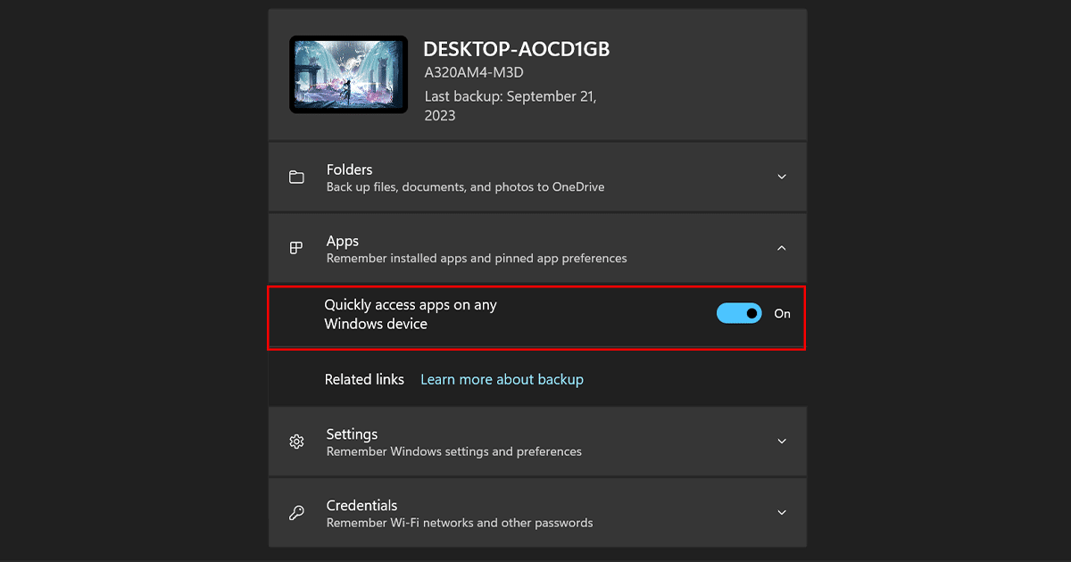 - 次の「トグルスイッチ」をオンにします。Windowsデバイスのクイックアクセスアプリ」Microsoftストアアプリをクラウドにバックアップするオプション。