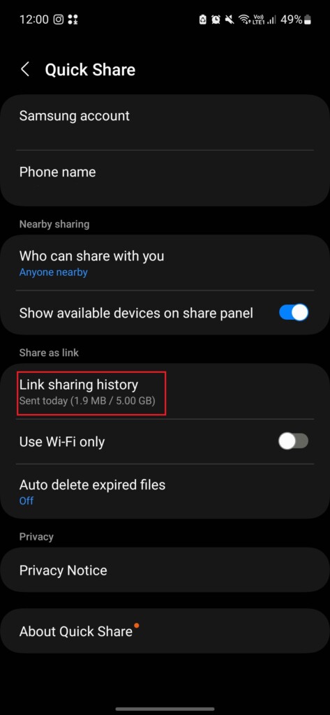 1。に行きますクイックシェアのページ設定アプリ、タップリンク共有履歴。