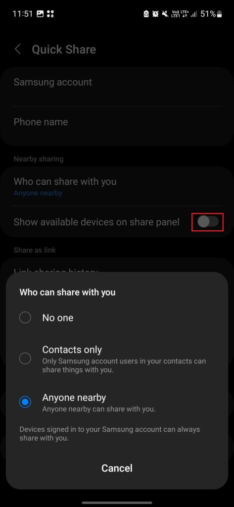 Samsung Quick Shareを無効にすることはできますか?