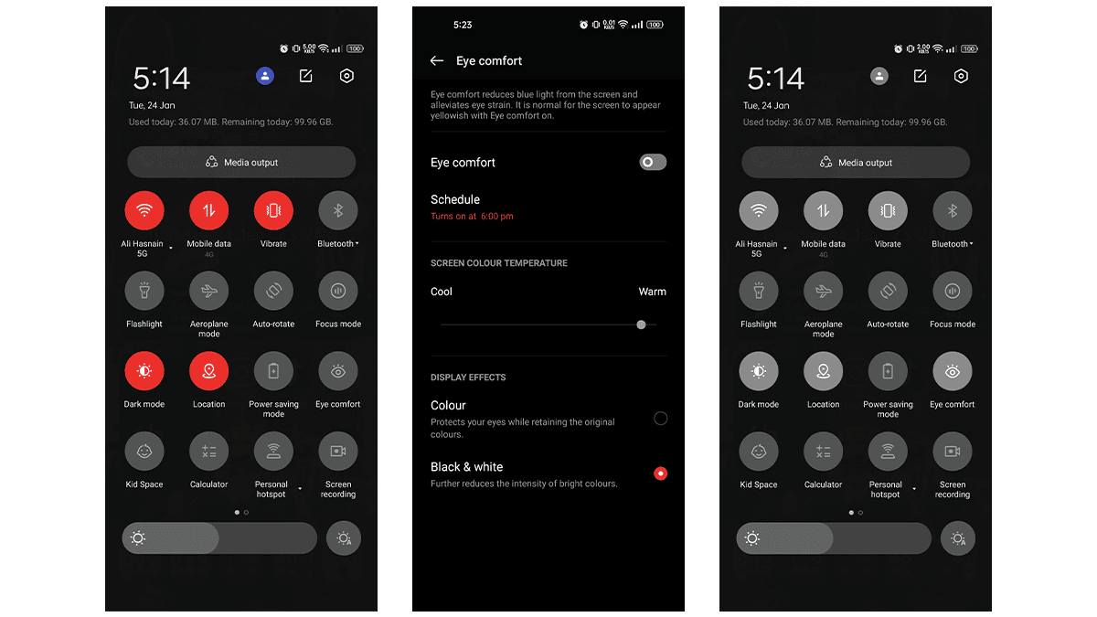 - 目の快適さモードは、画面から青色光を減らし、眼のひずみを軽減します。彼らは目に優しい温かい光を提供し、また画面を白黒画面に切り替えるオプションも提供します。