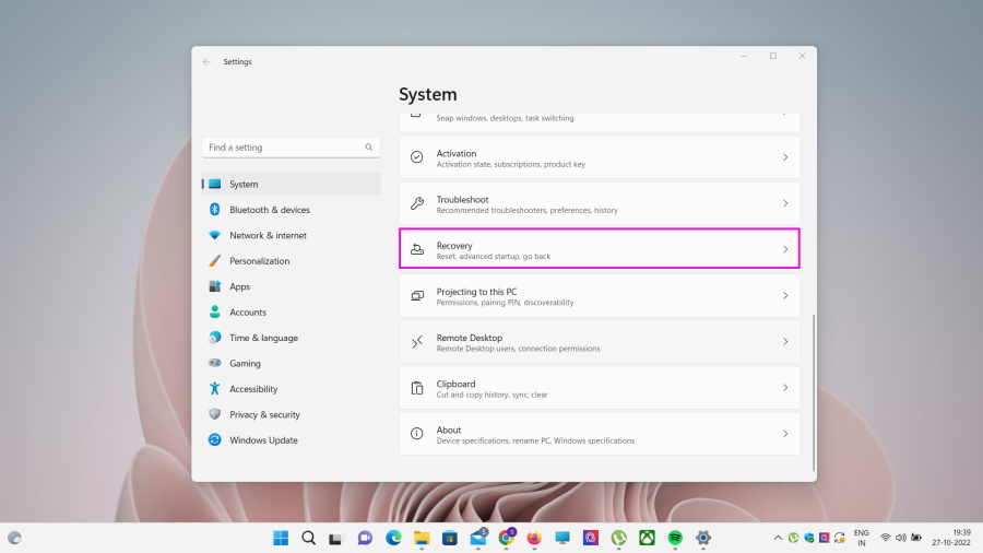 2。を選択しますシステムをクリックします回復ページの右側のタブ。