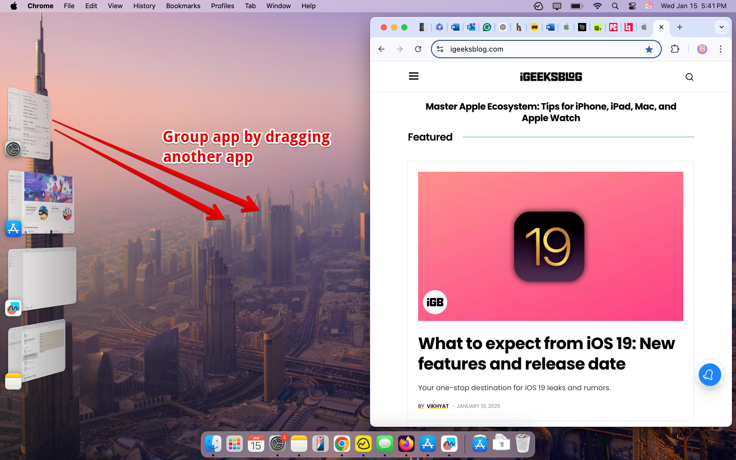マック上のステージマネージャーとアプリをグループ化するには、画面の左側にある最近のアプリスタックからアプリをドラッグし、既にオープンしたアプリの上にドロップします。これにより、両方のアプリがグループ化されます。グループに最大4つのアプリを追加できます。