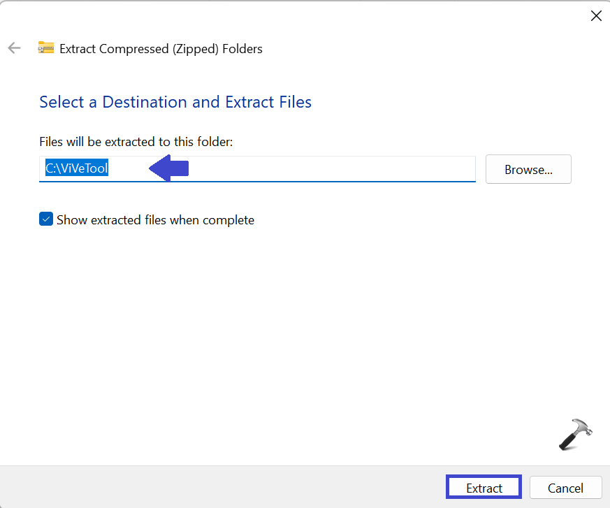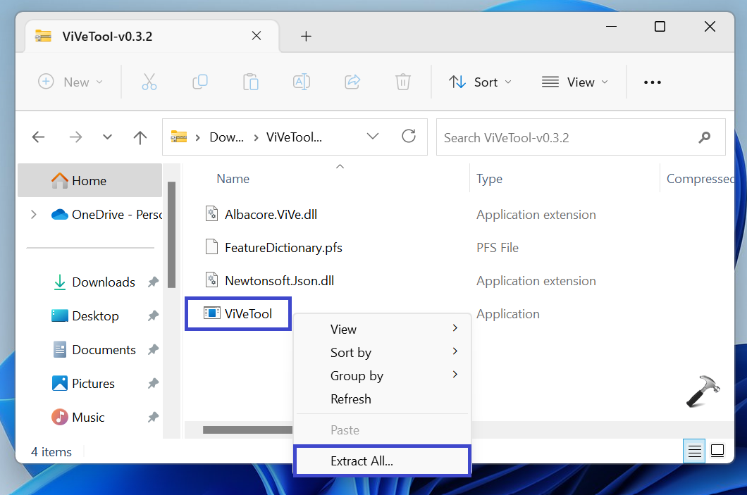 Vivetoolアプリケーションを右クリックして、「すべてを抽出してください。」を選択します。