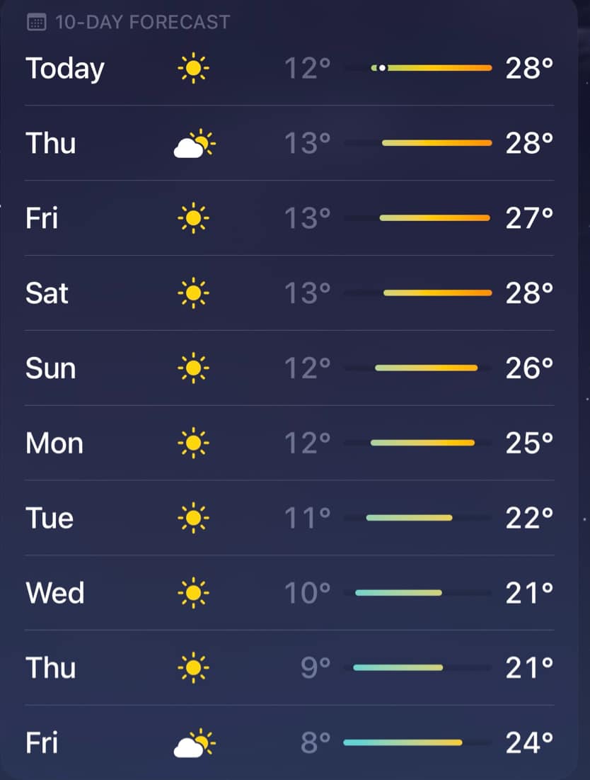 まず、色付きのバーの長さは、1日を通して温度の変動を表します。未着色の背景バーの長さは、10日間の温度の変動を表しています。白いドットは、予測に基づいた現在の温度を表します。