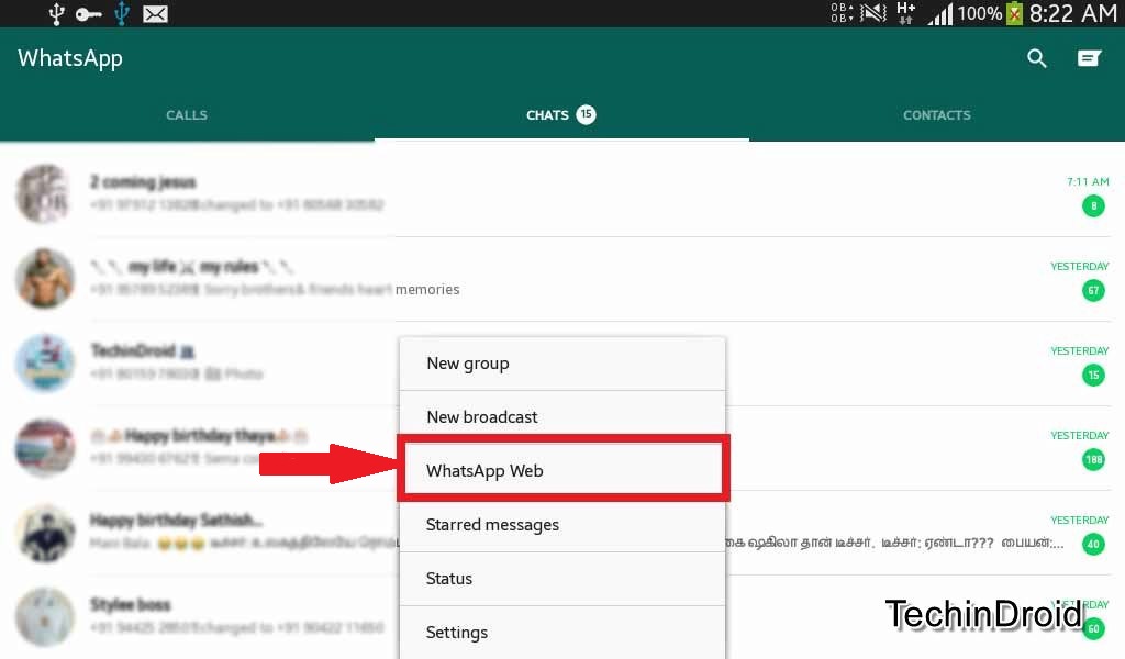 - チャットに(モバイル上)のWhatsAppのAndroidバージョンでは、タップをタップしますメニューアイコンと選択WhatsApp Web。