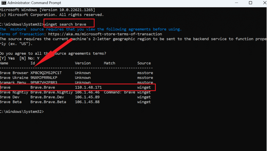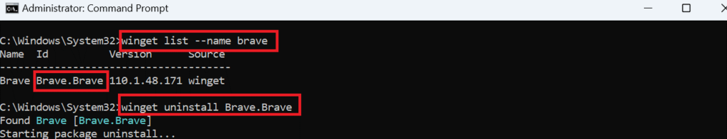 - このコマンドを使用するには、(名前)セクションを削除するアプリの名前に置き換える必要があります。私の場合、それは勇敢なブラウザアプリですので、コマンドはWinget List –Name Brave