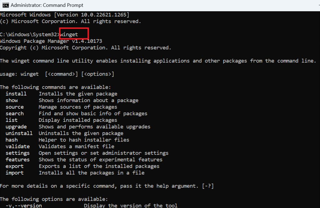- Windowsパッケージマネージャーが既にコンピューターにインストールされている場合、さまざまな追加のWingetコマンドを表示できます。つまり、すべて使用を開始することができます。