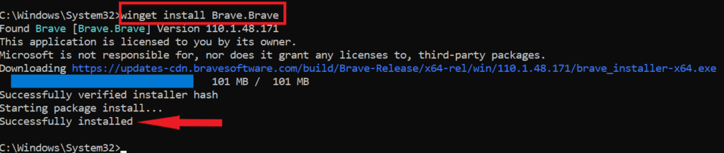 - タイプ 'Wingetインストール(ID) 'アプリケーションをインストールするコマンド。を交換します「(id)」ダウンロードするアプリのIDが含まれています。私の場合、それは勇敢な'